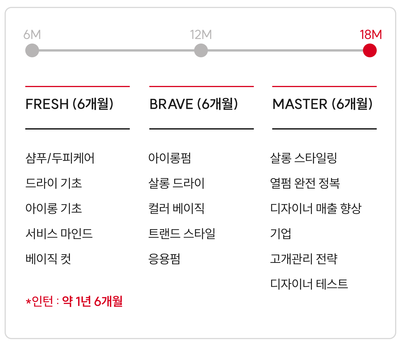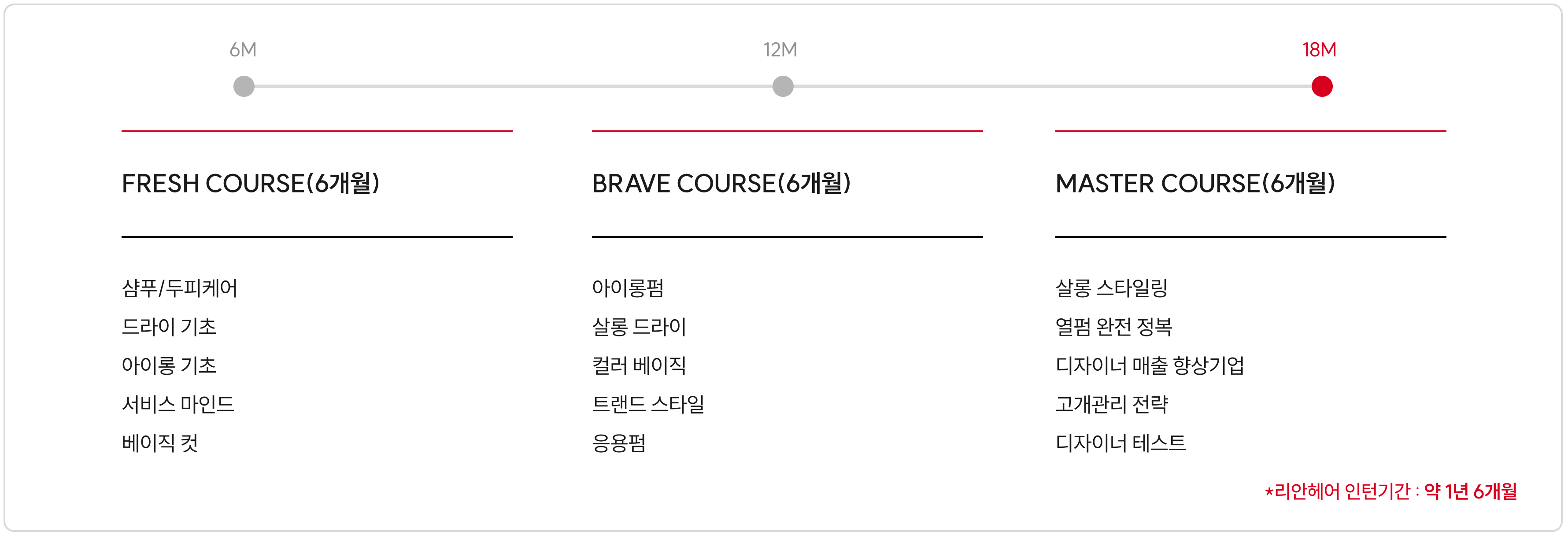 프로를 만드는 25년의 힘, 리안뷰티아카데미 리안뷰티아카데미는 25년의 교육 노하우로 완성된 실전 중심의 아카데미입니다. 살롱 현장에 최적화된 교육 시스템을 통해, 인턴부터 디자이너까지 직급별 필수 역량을 1:1로 세심하게 지도합니다. 체계적인 직무 교육으로 더 빠르게, 더 완벽한 프로가 될 수 있도록 지원합니다.