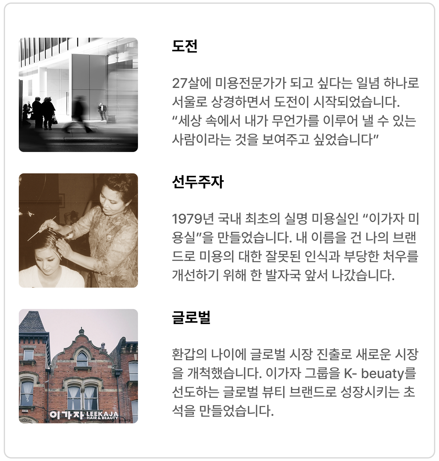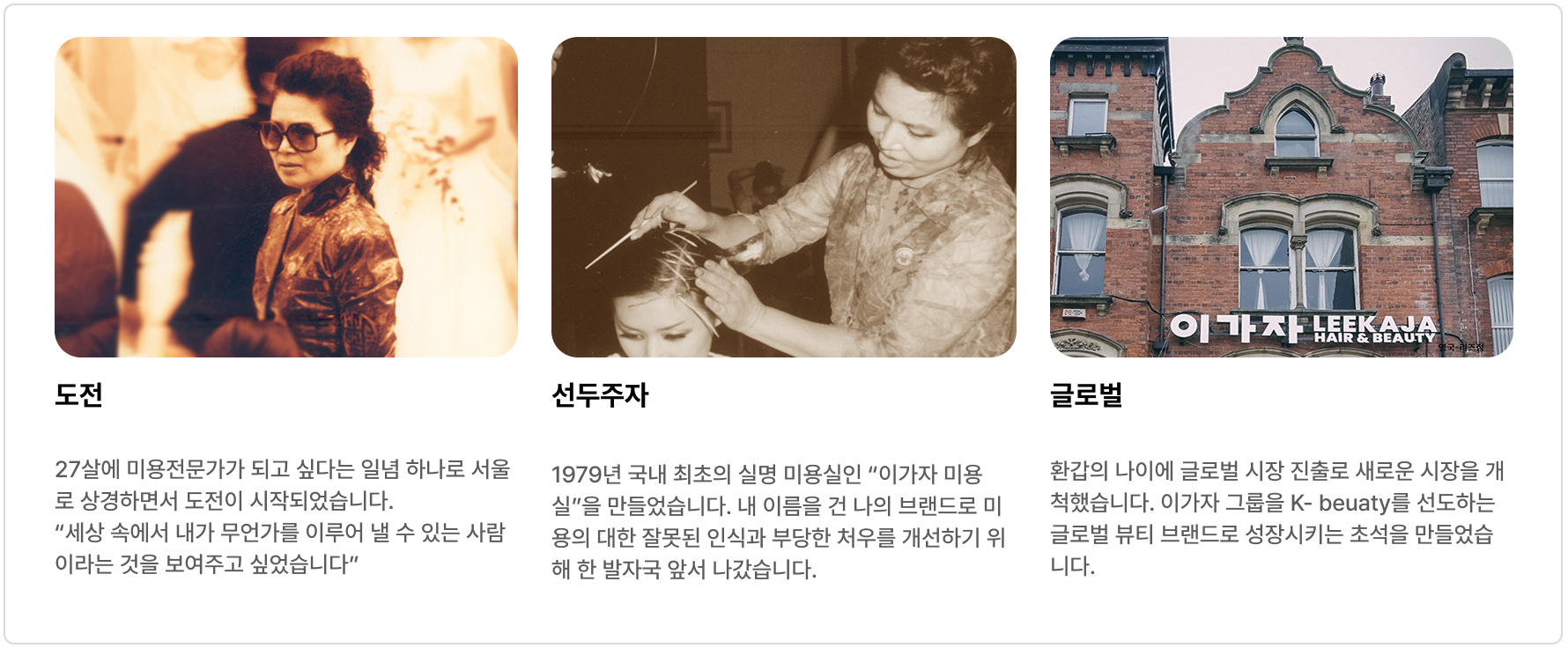 1979년 국내 최초의 실명 미용실인 “이가자 미용실”을 만들었습니다. 내 이름을 건 나의 브랜드로 미용의 대한 잘못된 인식과 부당한 처우를 개선하기 위해 한 발자국 앞서 나갔습니다.