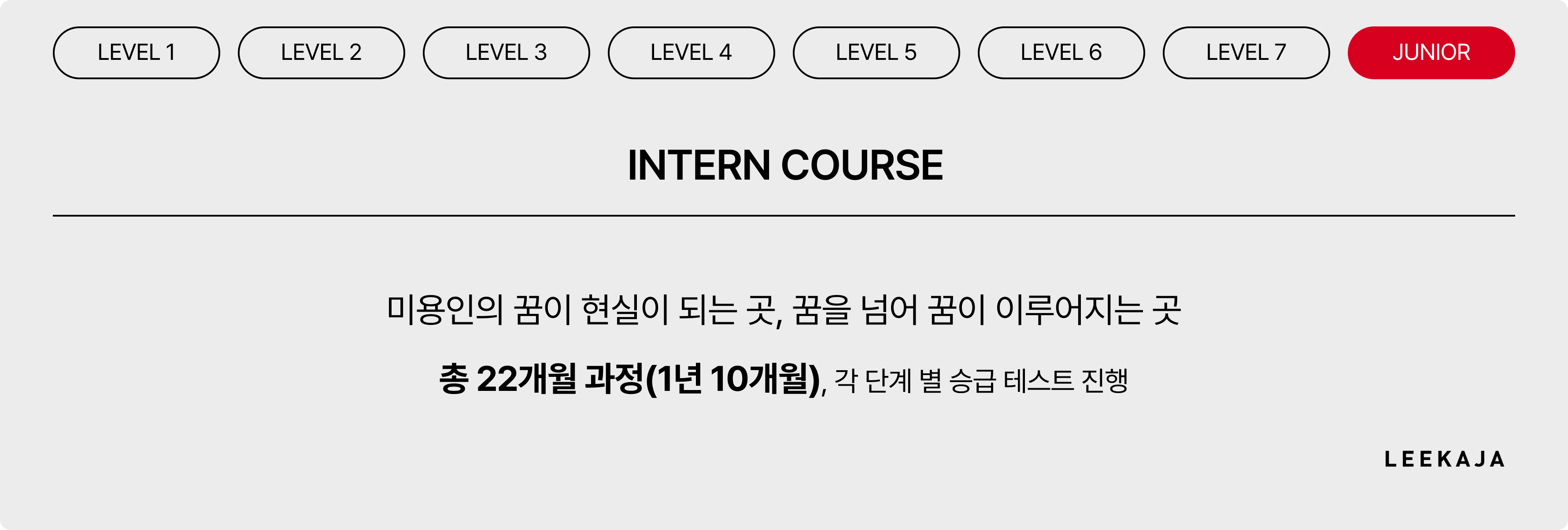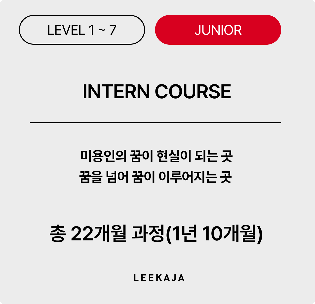이가자의 인턴 과정은 총 22개월 과정(1년 10개월)입니다. 각 단계 별 승급 테스트 진행 각 과정 모두 이수 후 주니어 스타일리스트 오디션 진행합니다. 차별화 된 프로그램과 우수한 강사진이 개인별 컨디션에 맞춘 레벨 교육 시스템으로 미용인으로 갖춰야 할 인성, 마인드, 서비스 교육을 병행하여 인품과 소양을 겸비한 인재를 양성하고 있습니다.